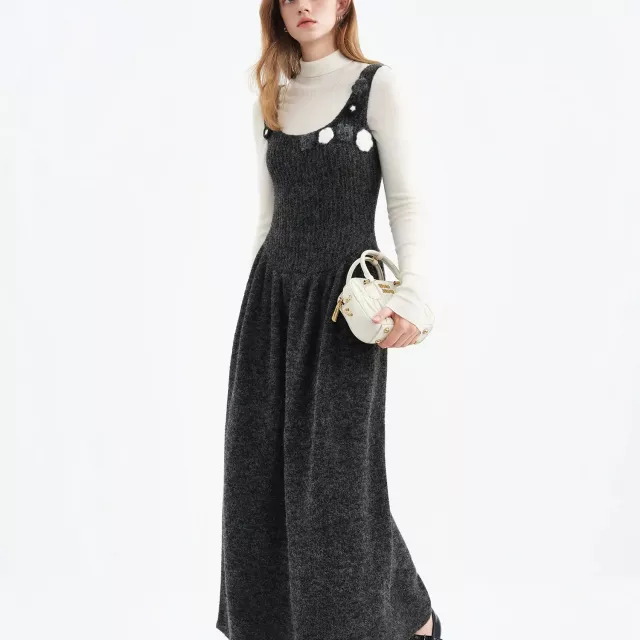 The 3D tie-flower details add a subtle texture that catches the light and gives the dress a unique, premium feel. Unlike plain winter dresses, this one stands out with its delicate surface design while still keeping a clean, minimal look. The U-neckline enhances your natural neckline, while the sleeveless suspender style makes it easy to layer over long-sleeve tops, shirts, or knit sweaters.